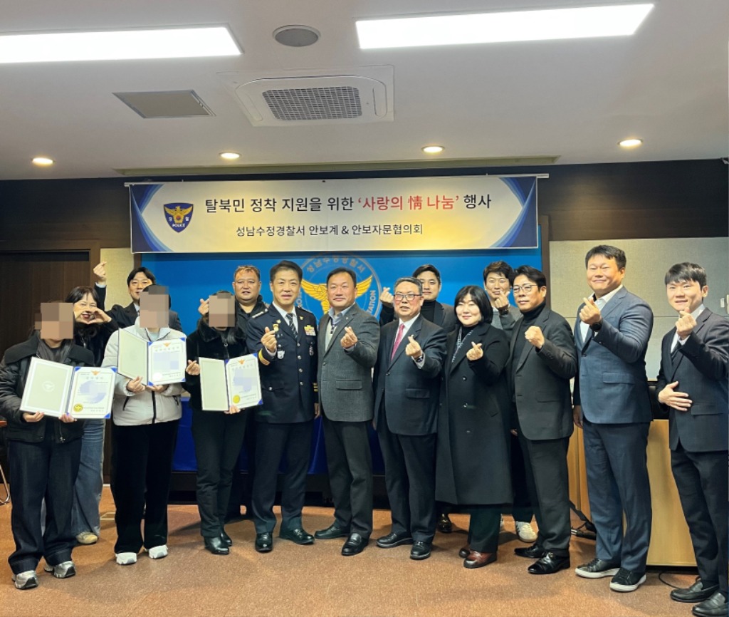 - 연말 맞아 따뜻한 나눔... 성남수정경찰서 안보자문협의회, 북한이탈주민 장학금 전달 성남수정경찰서(서장 박영수)와 성남수정경찰서 안보자문협의회(회장 서종근)는 지난 18일 오전 경찰서 2층 소회의실에서 북한이탈주민을 대상으로 장학금 전달식을 개최했다. 이번 행사는 연말…