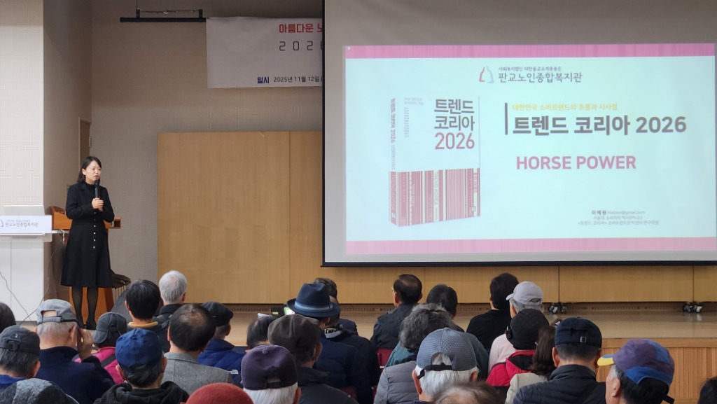 ▣ ‘2026 대한민국 트렌드 전망’으로 기술 문명 속 인간적 가치 재발견 사회복지법인 대한불교조계종봉은이 운영하는 판교노인종합복지관(관장 일운)은 지난 11월 12일(수) 서울대학교 소비자학 박사 이혜원 박사를 초청하여 ‘2026 대한민국 트렌드 전망’을 주제로 인문학 명사 …