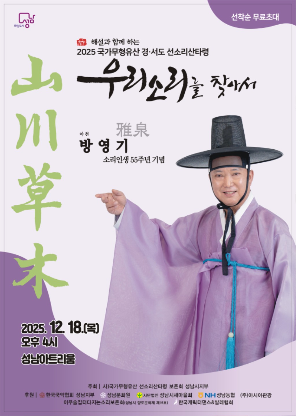 국가 무형유산 ㈔선소리산타령보존회 성남시지부(지부장 방글)가 주최하고, 성남시·성남문화원·성남국악협회가 후원하는 ‘2025 우리 소리를 찾아서’ 특별공연이 12월 18일 오후 4시 성남아트리움 대강당에서 열린다.