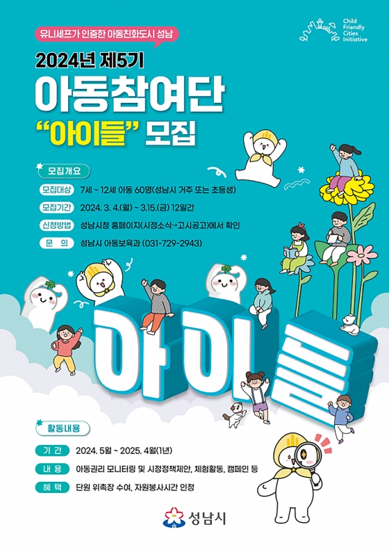 성남시는 오는 3월 15일까지 ‘제5기 아동참여단’으로 활동할 60명의 단원(아이들)을 모집한다.