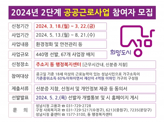 성남시(시장 신상진)는 오는 18일부터 22일까지 ‘2024년도 2단계 공공근로사업’ 참여 희망자 440명을 모집한다.