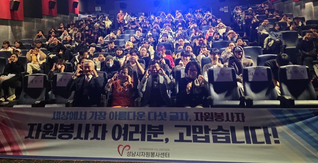 - 우수 봉사자와 사회공헌기업 임직원, 대학생 봉사단 등 참여 성남시자원봉사센터(센터장 장현자)는 12월 2일(화) 저녁 7시, CGV 야탑점에서 ‘성남시 우수자원봉사자 문화힐링데이 4차 영화감상회’를 성황리에 개최했다. 이번 행사는 평일 낮 시간대 참여가 어려웠던 직장인·청…
